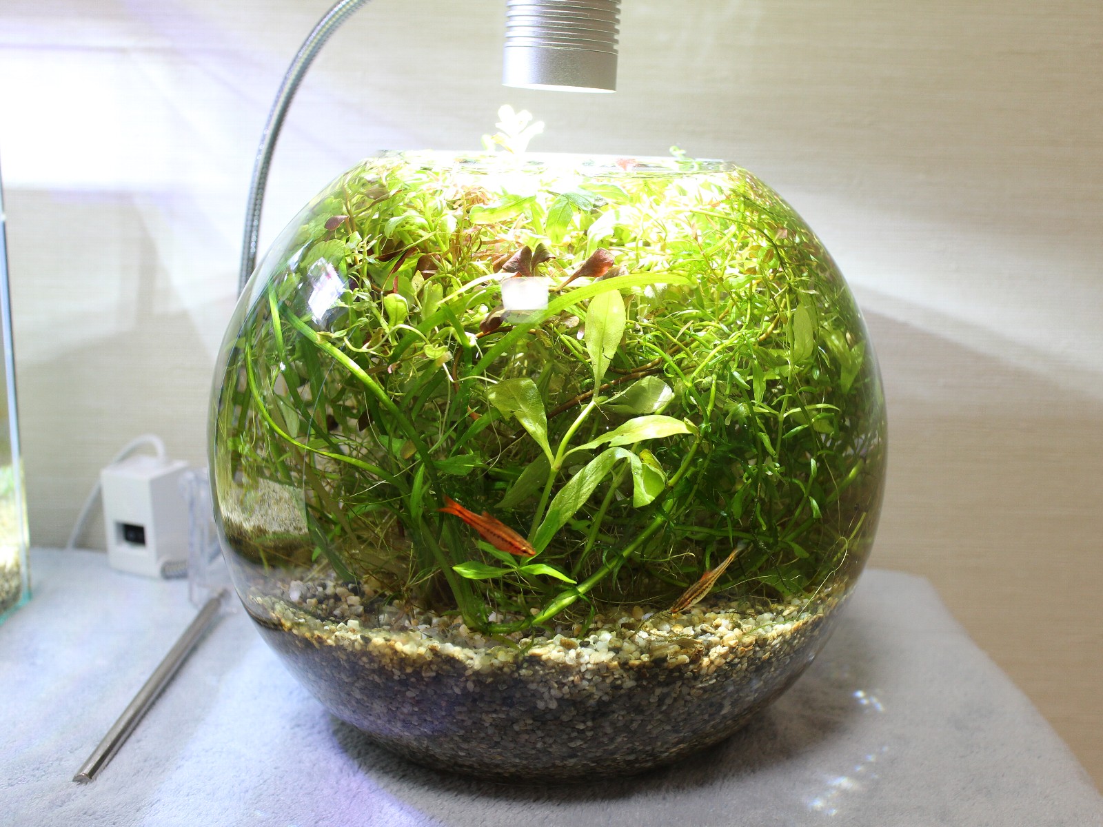 GEX「グラスアクア スフィア」に水草を植えると、3日ほどで水面から水草が顔を出すほど成長した。水草の全体的な調子は悪くないようだ。