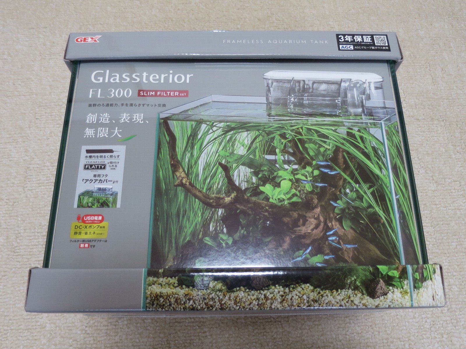 今回使った商品はGEXの「グラステリアFL300 スリムフィルターセット」と「クリアLED POWER III 300」である。水槽のサイズは横幅30cm、高さ25cm、奥行き20cmで、水槽を置く場所に合うサイズのものを選択した。水量は13リットルである。