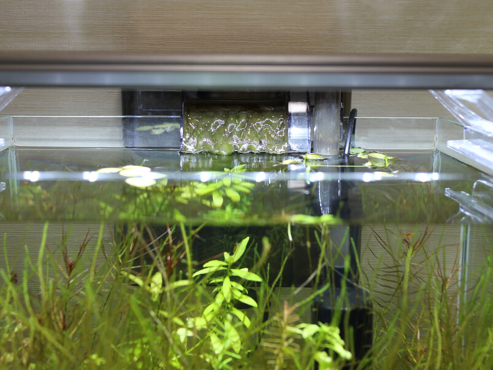 外掛けフィルターの水が排出されるところにコケがたくさん溜まっていて、いつか掃除しなきゃいけないなとは思っていた。掃除をせずに溜まったコケが水流に耐えきれなくなり、水槽の中へ落ちてしまい、そのコケにエビたちが群がっているという感じである。