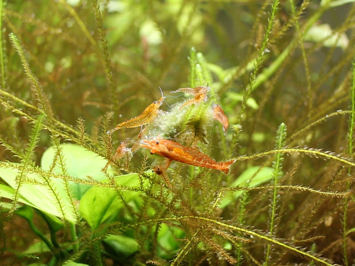 この30cm水槽においてエビには特別に餌を与えるということはしてなくて、いつも一ヵ所に集まることなくバラバラで水草をツマツマしている。そのため今回の光景はかなり珍しかった。