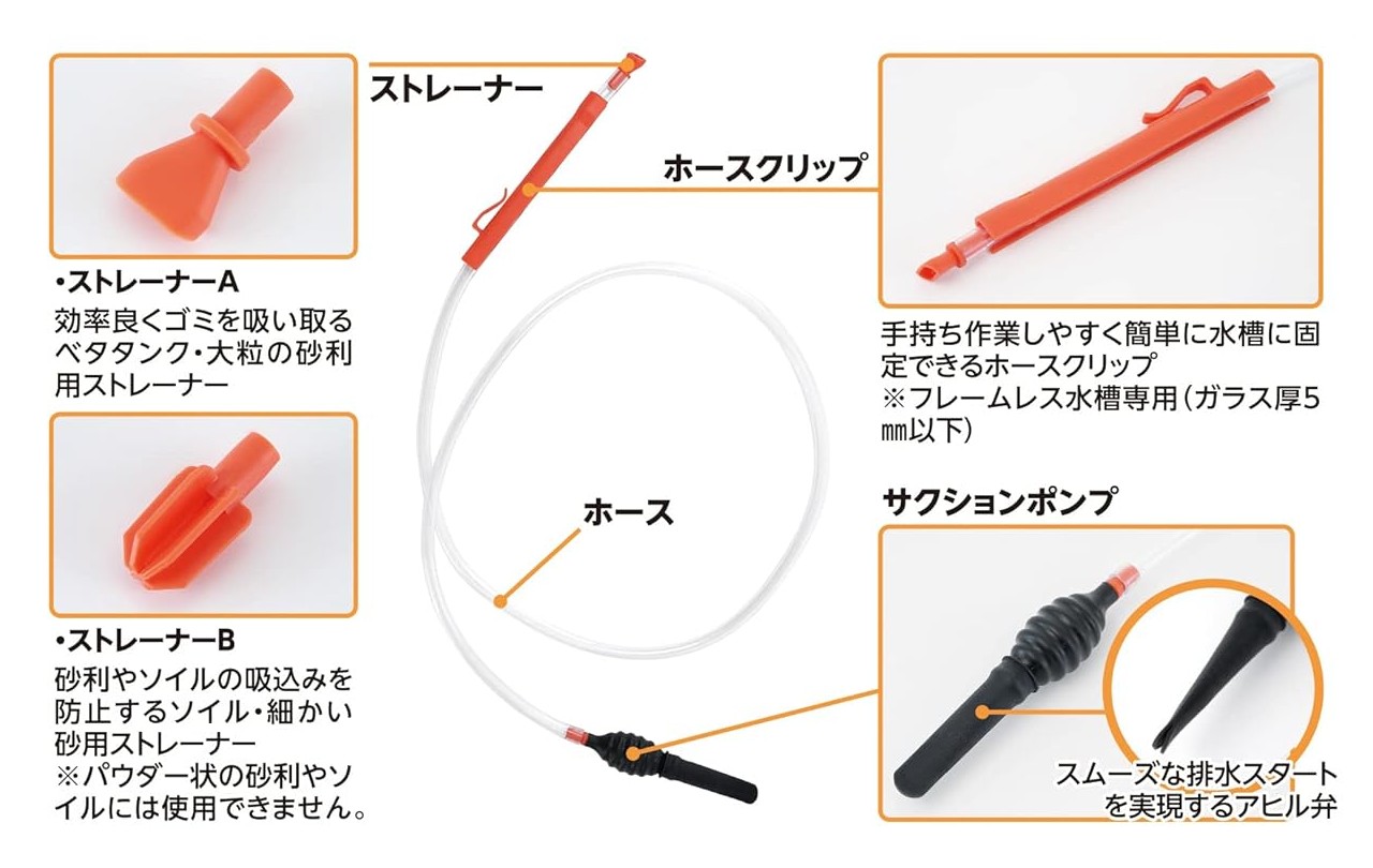 小型水槽に対応した水換えポンプの場合、水作の「クイック水替えポンプミニ」のように砂利やソイルの吸い込みを防止するストレーナーが付いたものもある。先端が底砂に直接触れても砂はストレーナーに引っかかって排出されず、汚れだけが排出される仕組みになっている。とても便利な商品だと感じている。