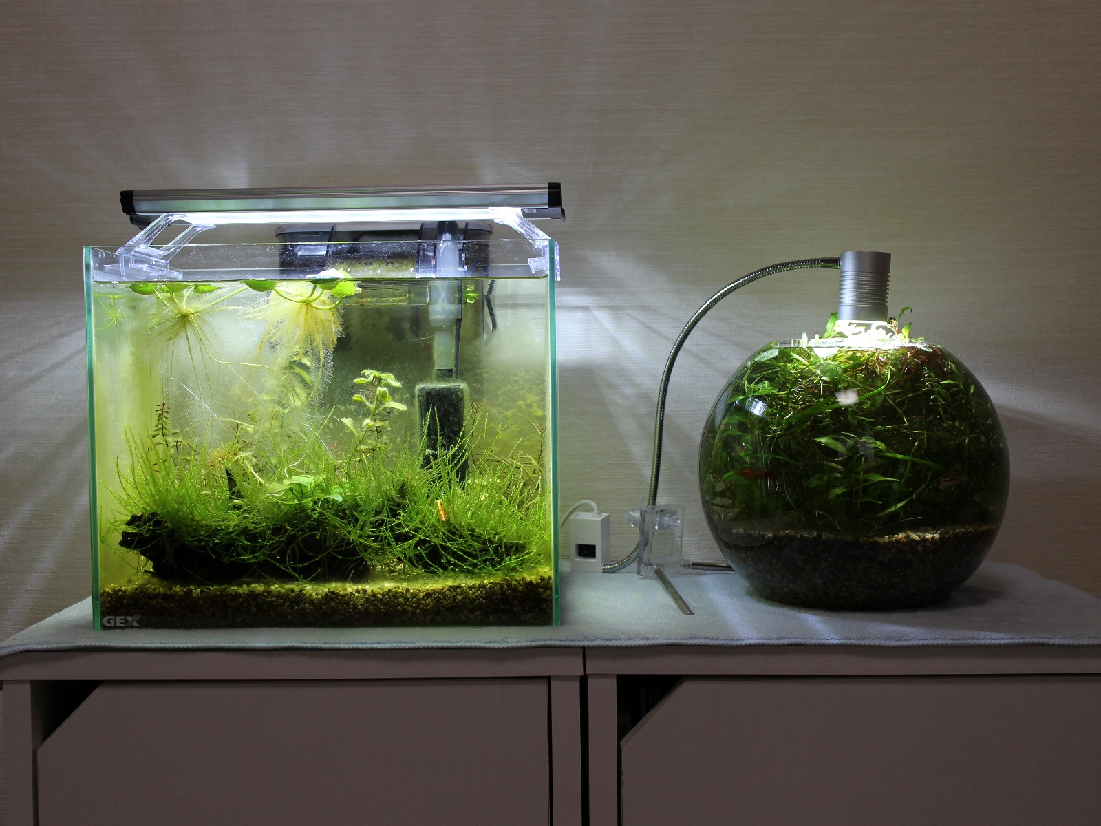 今使っているGEXの「グラスアクア スフィア」は上面のガラスが内側に向かう形をしていて基本的にはエビの飛び出しが起こりにくい構造になっている。この水槽でエビの飛び出しが起きた時は、前日に足し水をした際に少し水を入れ過ぎて水位が上がってしまっていた時である。