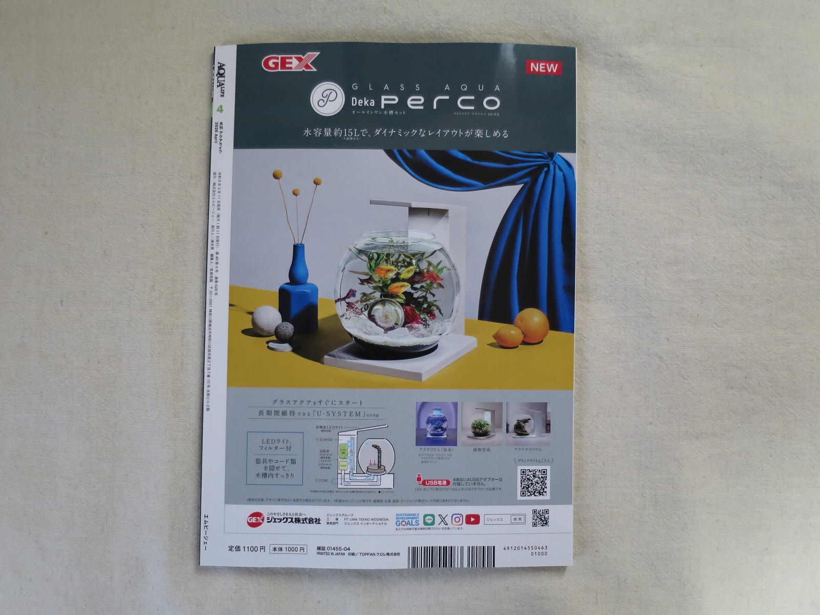 今話題の『最新 アクアリウム超飼育図鑑 3000種』の発行記念インタビューも載っている。裏面の広告ページにはGEXから新しく発売された水容量約15リットルのオールインワン水槽「グラスアクア デカペルコ」が掲載されている。Amazonでは電子書籍のKindle版も販売している。