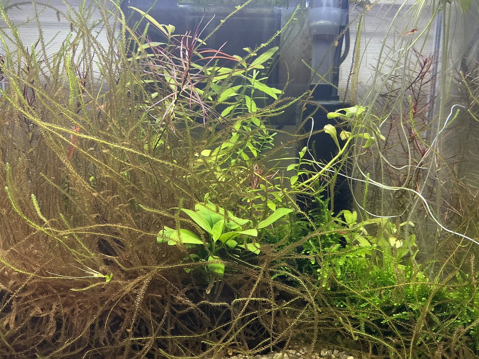 水道から出る水を使って元気に育てられる水草やモスを選んでいく方針でよいかなと思っている。ウィローモスについては半分諦めているが、今は水槽の右半分にウィーピングモスが1カップ分入っていて、その成長を見守りたい。同じ結果になるかもしれないが、ウィローモス以外のモスも試していく予定だ。