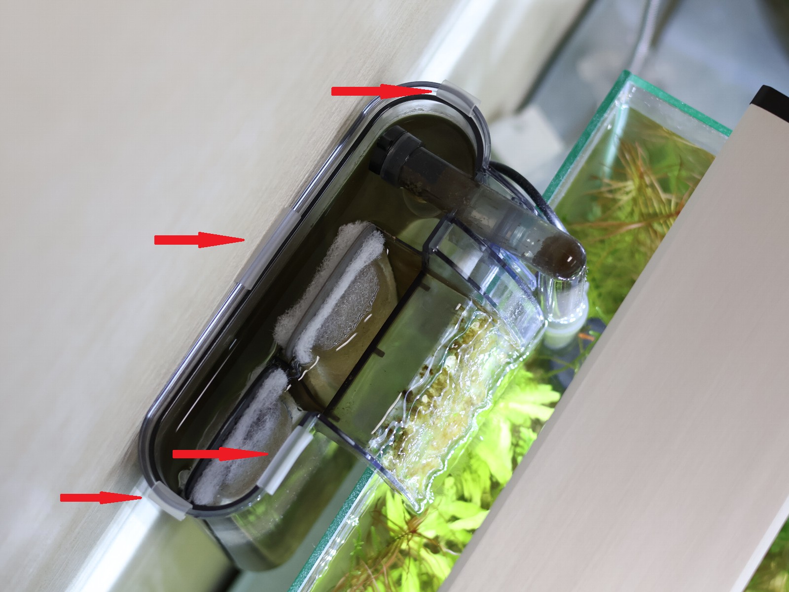 外掛けフィルターは安くて便利だが、時々異音の問題に悩まされることがある。フィルターがカラカラと音を鳴らす時はモーター部分などに空気が入っているためなのでフィルターを傾けるなどして空気を抜く必要がある。