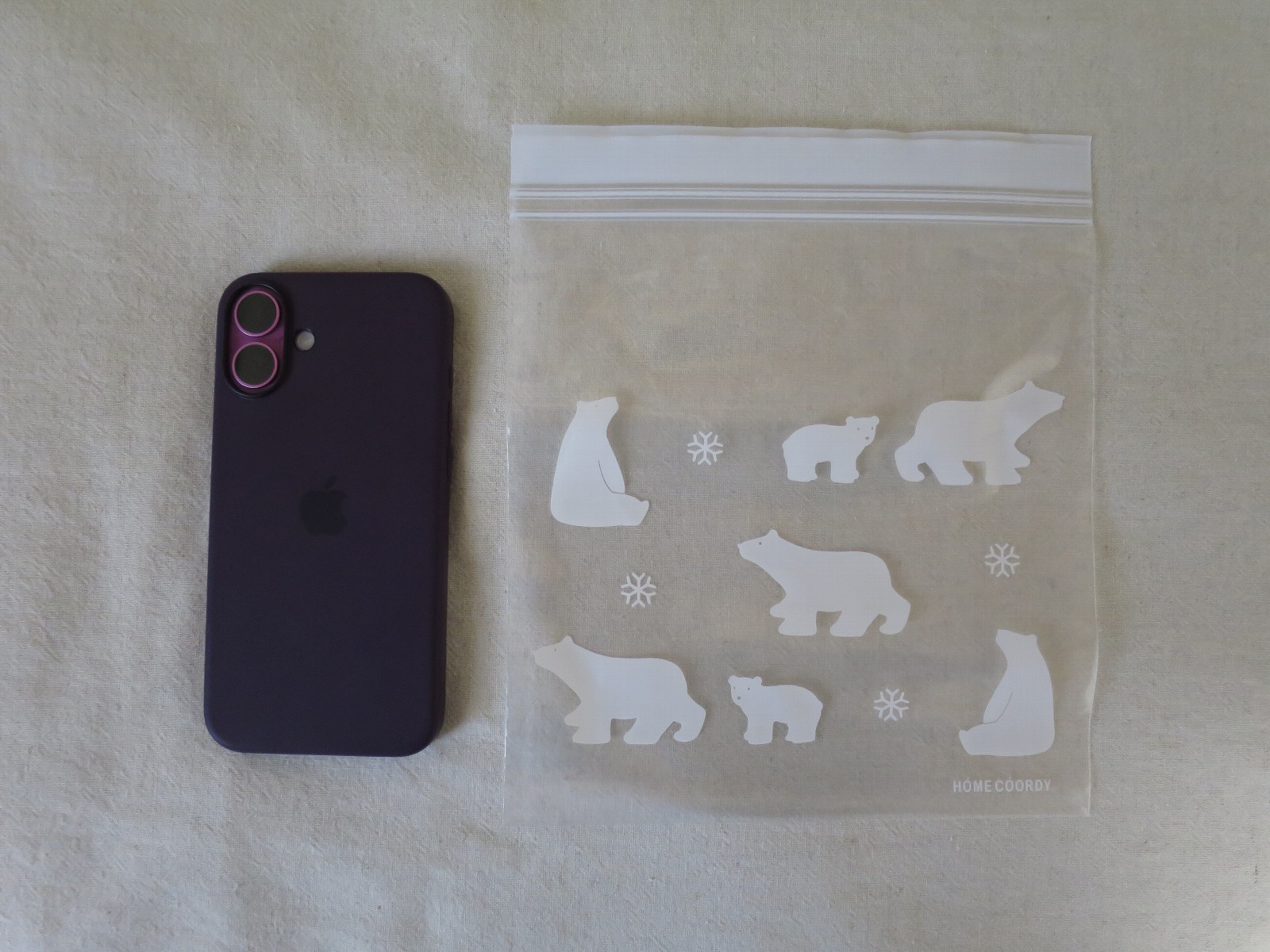 撮影のために用意したのはスマホのiPhone 16 Plusと家にあったフリーザーパックの2つ。スマホをフリーザーパックに入れてジッパーをちゃんと閉めて撮影するだけである。