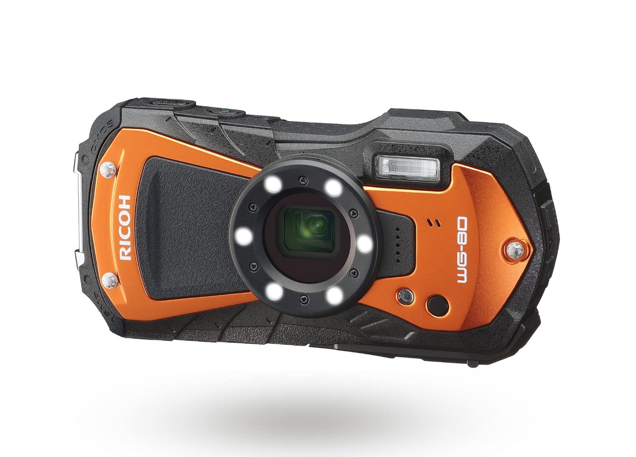 コンデジにはアウトドアで使用するような防水カメラというものがあり、これを使う方法もある。上の画像はRICOH WG-80 ORANGEである。このカメラは水深14mで連続2時間の撮影が可能となっている。