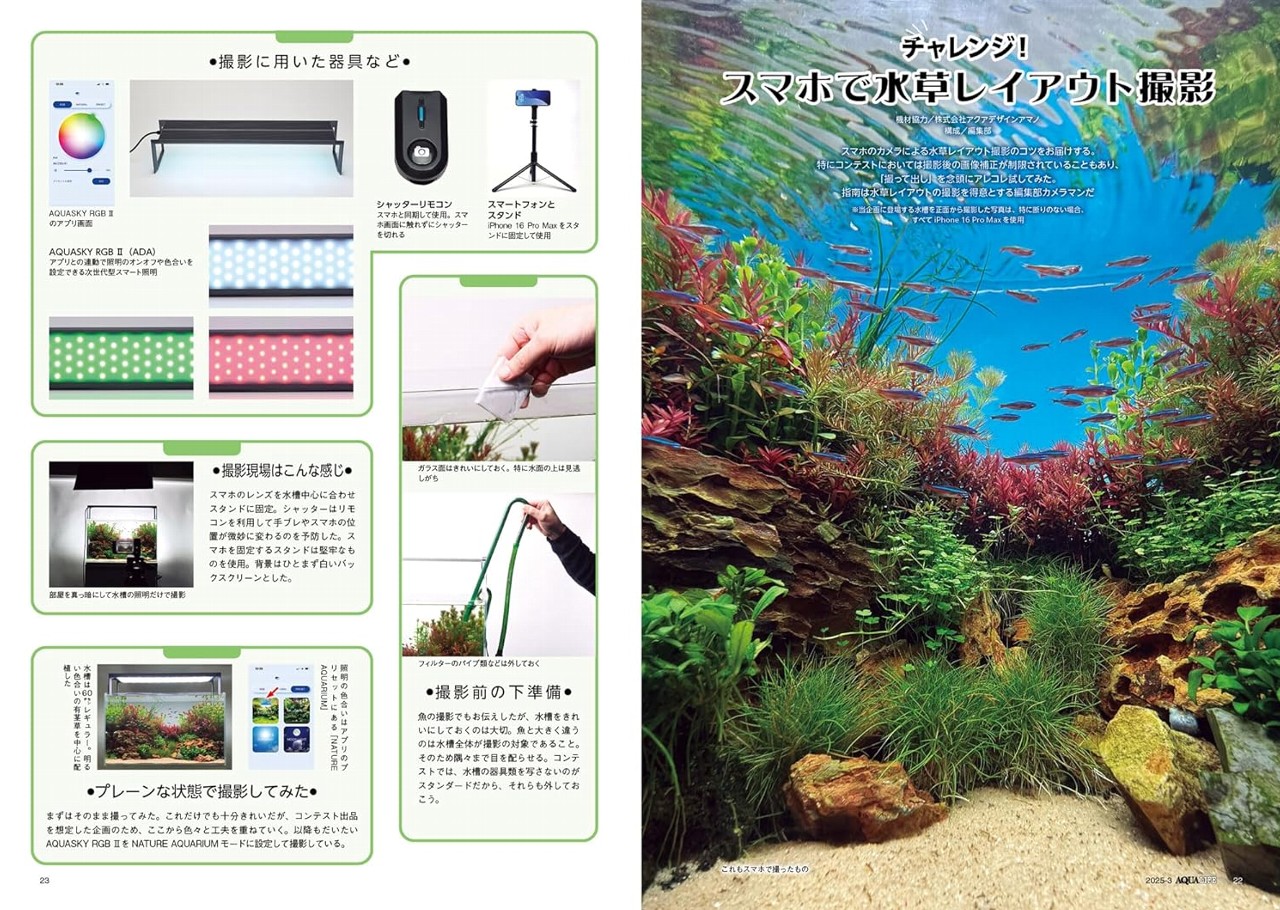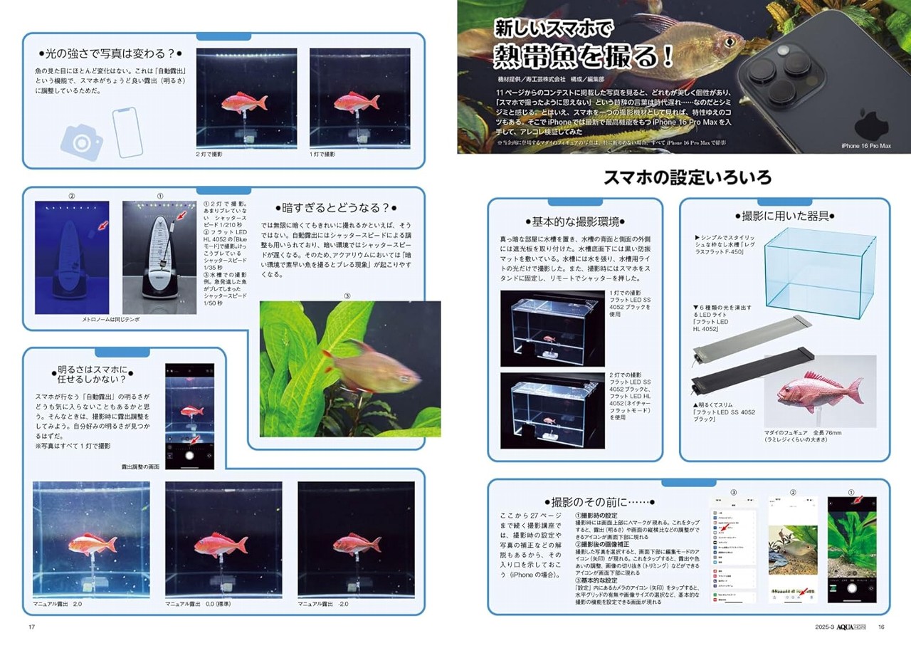 スマートフォンはいまや日常生活のあらゆるシーンで欠かせないツールであり、その機能も日々進化し続けている。そんなスマホを使ってアクアリウムを楽しまない手はない。今回の特集では「スマホを使った撮影」をテーマに、皆さんのスマホライフ&アクアライフの新たな可能性を広げる方法を伝授する。読者がスマホで撮影した愛魚も掲載している。
