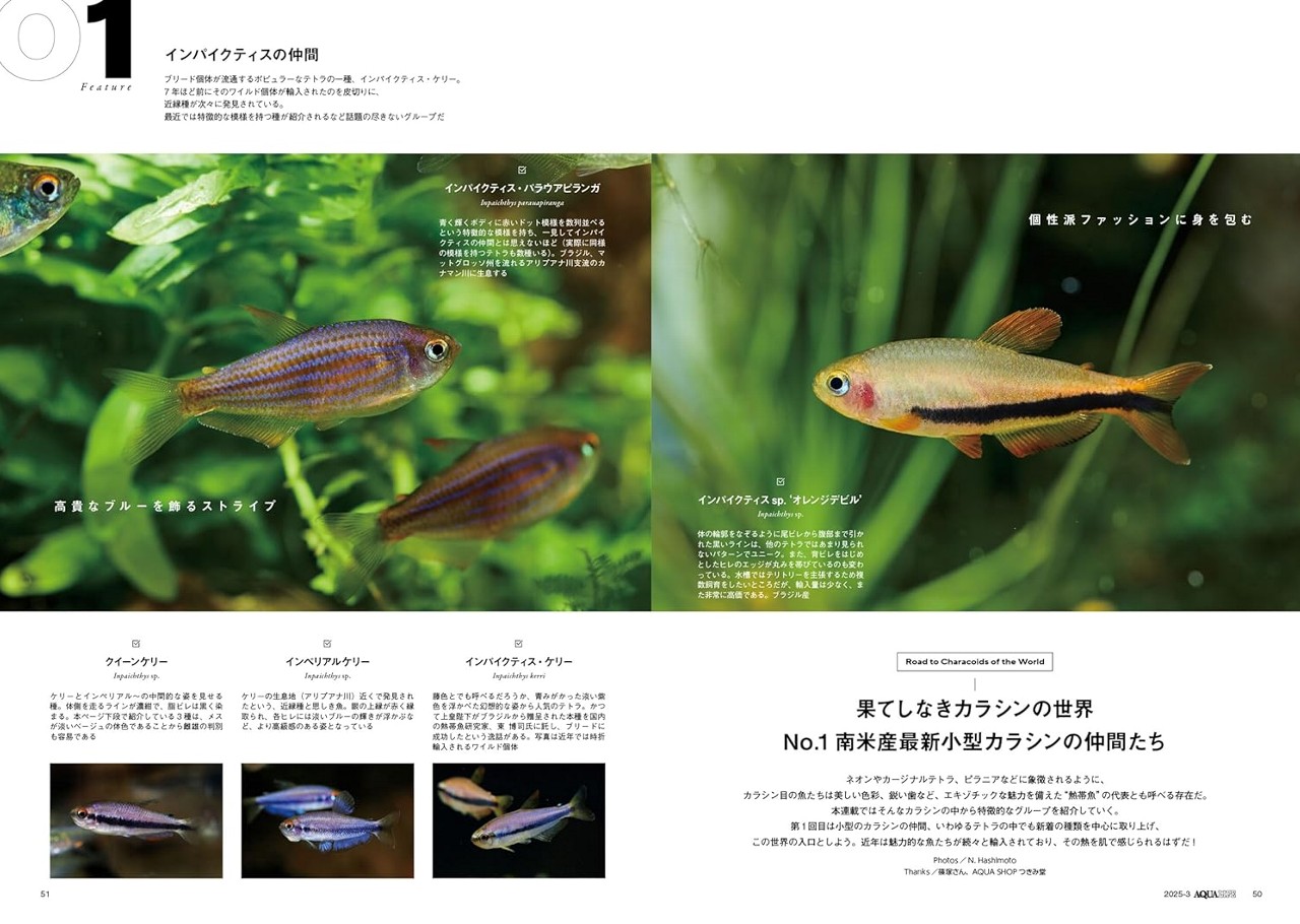 その他に中・小特集として、果てしなきカラシンの世界 南米産小型カラシン テトラコレクション、ニューフェイスぞくぞく!ヒルストリームローチ新時代、ナマズ小百科 チャカの仲間、メダカ新品種探訪 期待の表現!三つ尾のメダカ、水草レイアウト制作ノート、平たい石と個性的な水草を組み合わせたレイアウト、つかみどころのない彼らにグィッと迫る ハコガメの魅力、イベントレポート 第41回アクアリウムバスなどが掲載されている。
