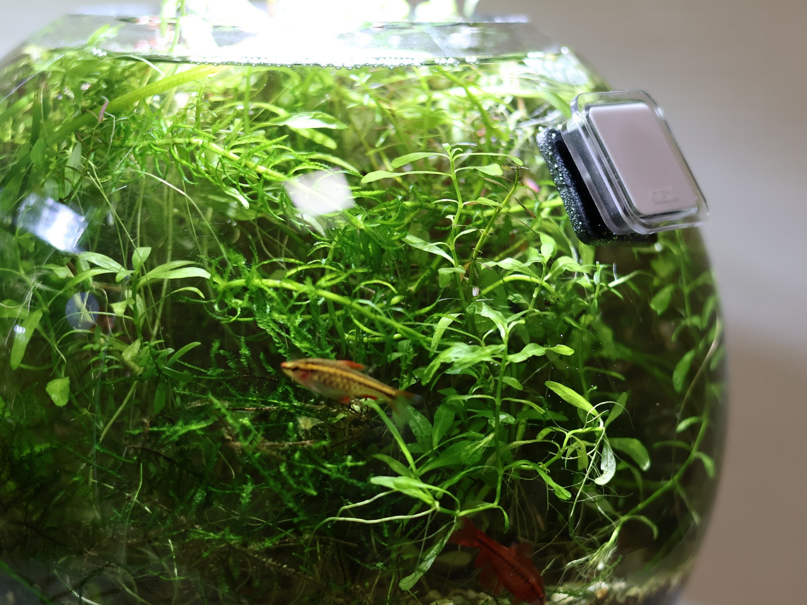 水槽の中の水を排出する時に使用するもの。特殊設計のアヒル弁を数回押して水の誘導を開始する。先端部分のパーツが2種類あり、主に底に敷かれた砂を吸い込まないタイプのものを使用して水換えといっしょに底床の掃除もしている。入っている生体はチェリーバルブ2匹とイエローチェリーシュリンプ複数匹だが意外と底床は汚れる。